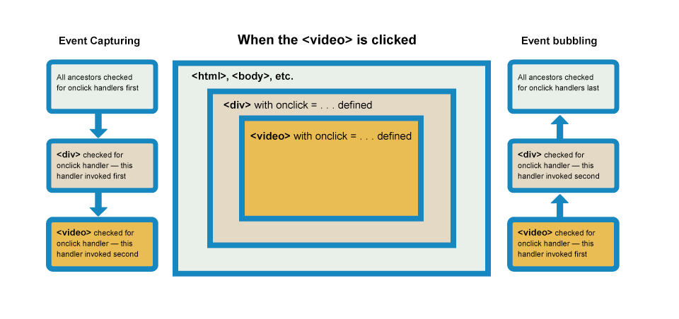 현대 브라우저들은 이벤트 핸들러가 기본적으로 버블링 단계에 등록되어 있으므로 캡처링보다는 버블링 단계를 통해 이벤트 전파가 일어나게 된다. (이벤트 핸들러가 캡처링 단계로 진행되게 하려면 addEventListener를 작성 시 세 번째 parameter로, 옵셔널한 parameter인 useCapture를 true로 지정해주면 된다)