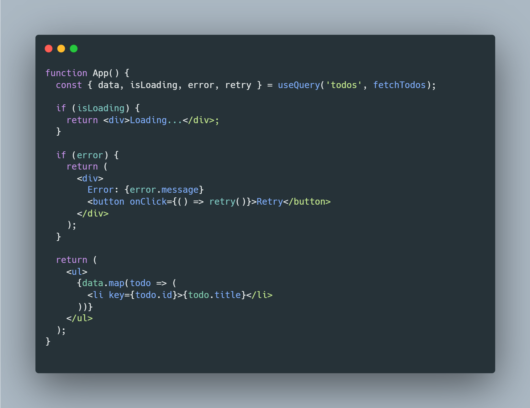 - Querying and Refetching : 쿼리를 시도하고 데이터를 리페칭하기 위한 간단한 API를 제공한다. 쿼리는 다양한 조건에 따라 자동으로 시도되거나 "refetch" 함수를 사용하여 수동으로 시도될 수 있다.