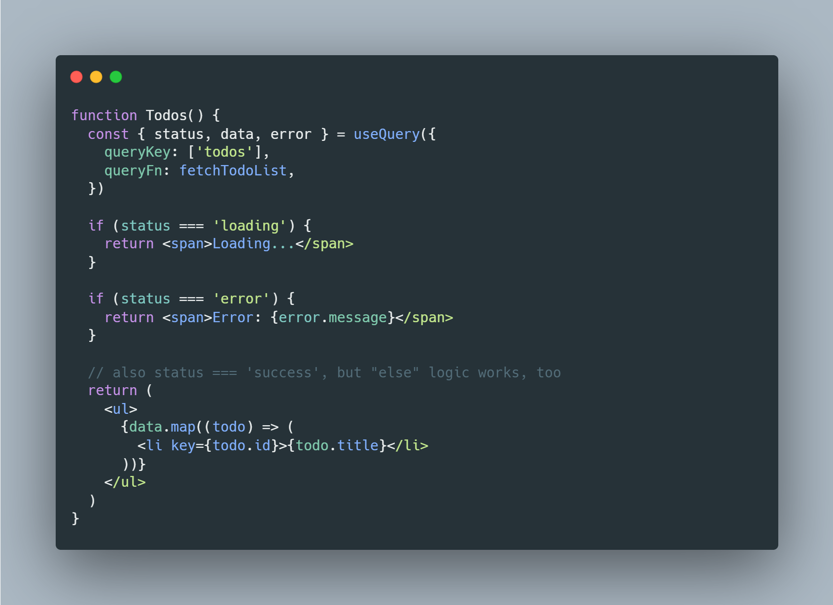 status의 경우 error, loading, success를 값으로 가지며 각각 쿼리에서 에러가 발생한 경우, 쿼리가 시작되지 않아 데이터를 받아오지 않은 경우, 쿼리가 성공하여 데이터를 받아온 경우를 의미한다. 각 상태는 또한 isError, isLoading을 통해서도 사용할 수 있으며 success인 경우 data가 존재하는 것으로 확인이 가능하다. status가 error 상태일 경우 error 값이 존재하여 error를 유저에게 표시해줄 수 있고, success 상태일 경우 data가 존재하여 이 데이터를 기반으로 UI를 나타낼 수 있다.