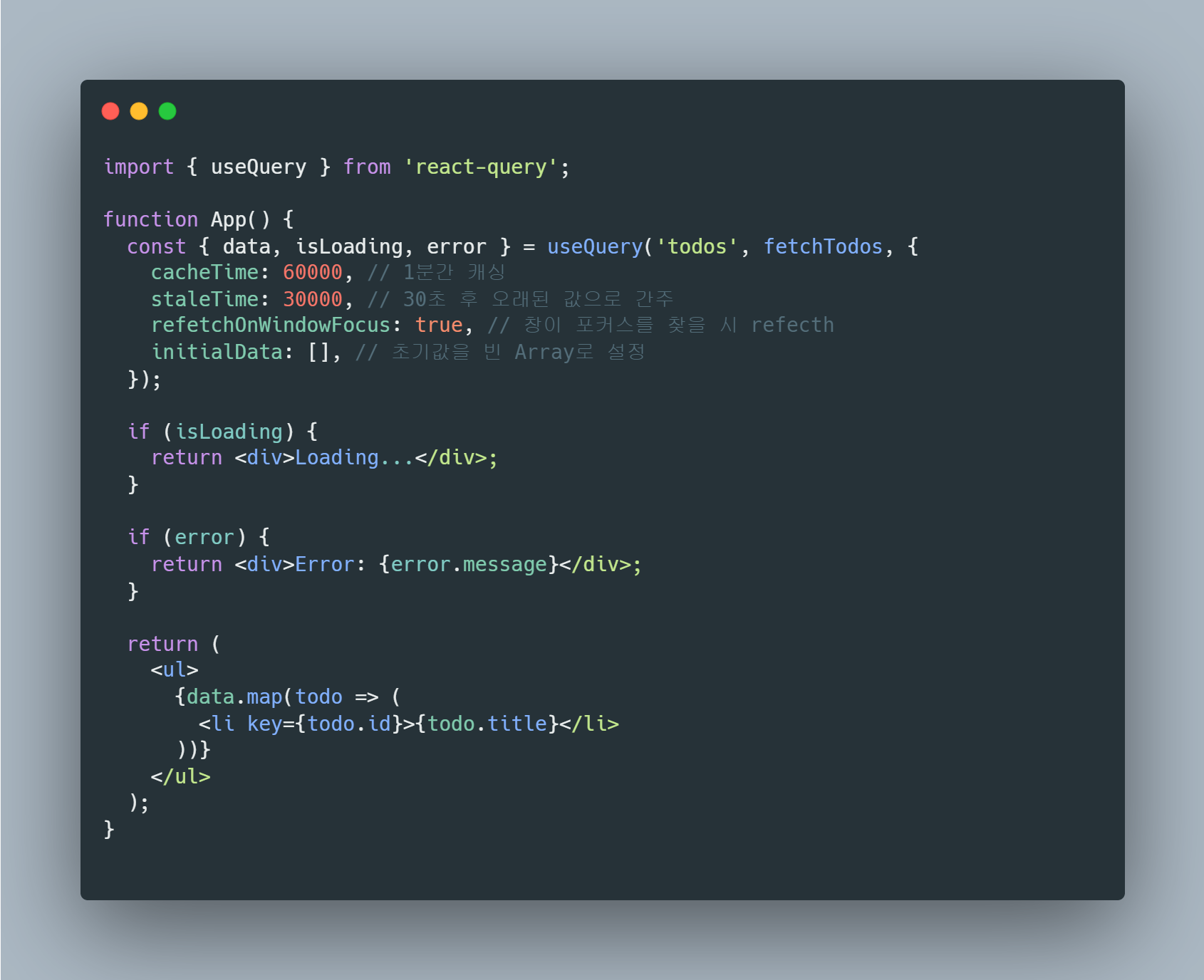 위 예시는 cacheTime, staleTime, refetchOnWindowFocus, initialData를 옵션으로 추가한 useQuery의 예시이다. 추가적으로 isLoading은 status가 loading일 시 true값을 가지며, 로딩 중임을 나타내는데 이용될 수 있다.