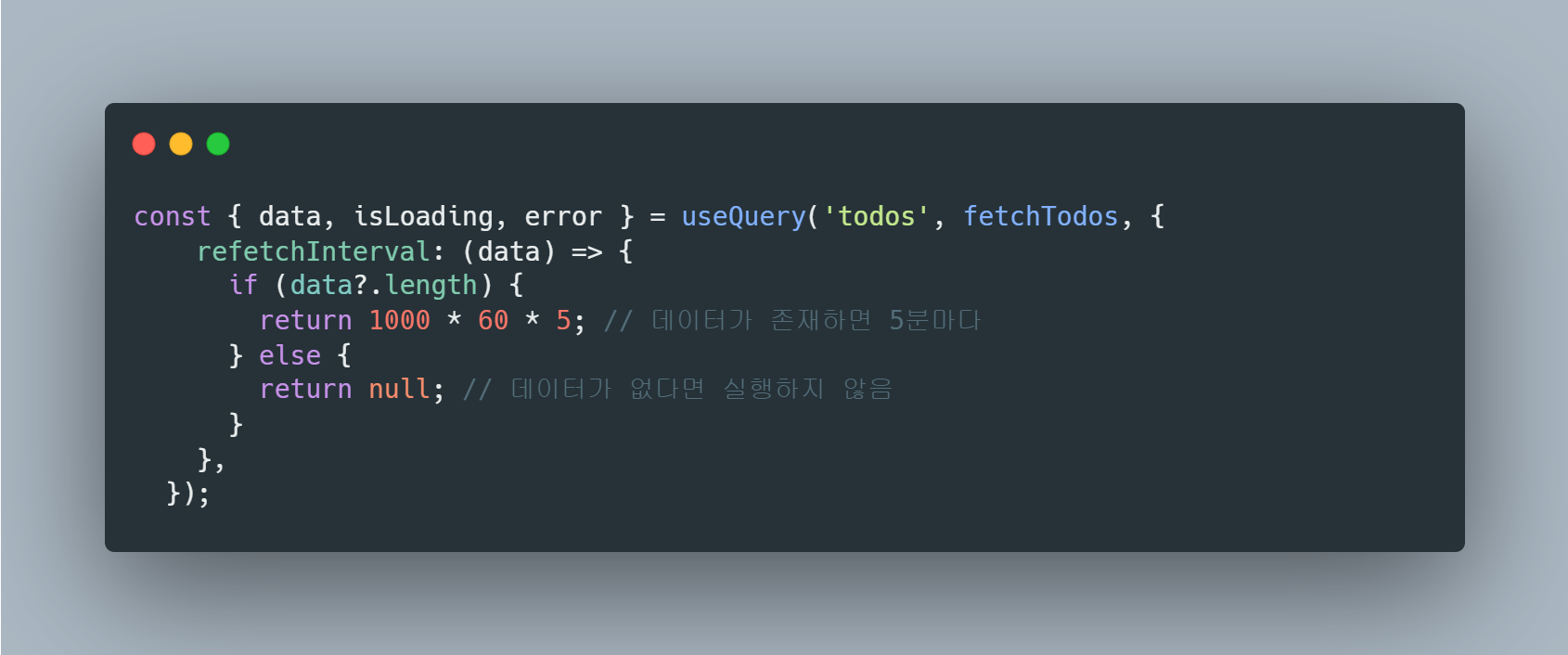 - refetchInterval : refetch가 얼마마다 일어날지를 밀리세컨드 단위(1000, 1초)로 설정하거나 몇 회만(5, 5회만) 일어날지를 설정할 수 있다. false로 지정하여 refetch를 자동으로 일어나지 않게 할 수 있고, 혹은 함수 형태로 지정하여 데이터 유무에 따른 처리를 분기할 수도 있다.