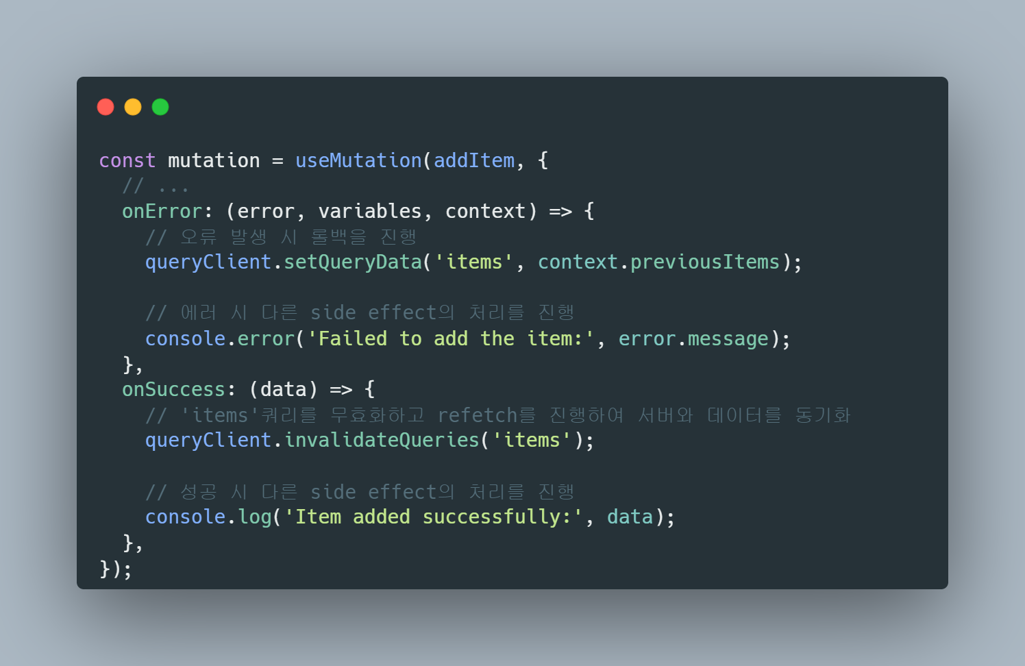 또한, 컴포넌트 내부에 피드백을 표시해야 하는 경우 useMutation 훅에서 제공하는 error 혹은 isSuccess 값에 액세스 하는 방식을 이용할 수 있다. 하지만 onErorr, onSuccess 콜백을 이용하면 mutation의 상태가 변경될 때 side effect가 한 번만 실행되도록 할 수 있다.