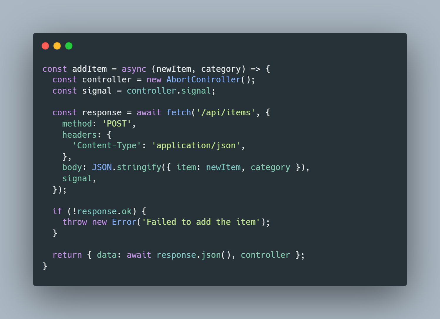 먼저 AbortController를 사용하여 cancel을 사용할 수 있도록 예시의 addItem 함수를 변경해보겠다. AbortController를 사용하면 AbortSignal을 발생시켜 fetch 요청을 취소할 수 있다.