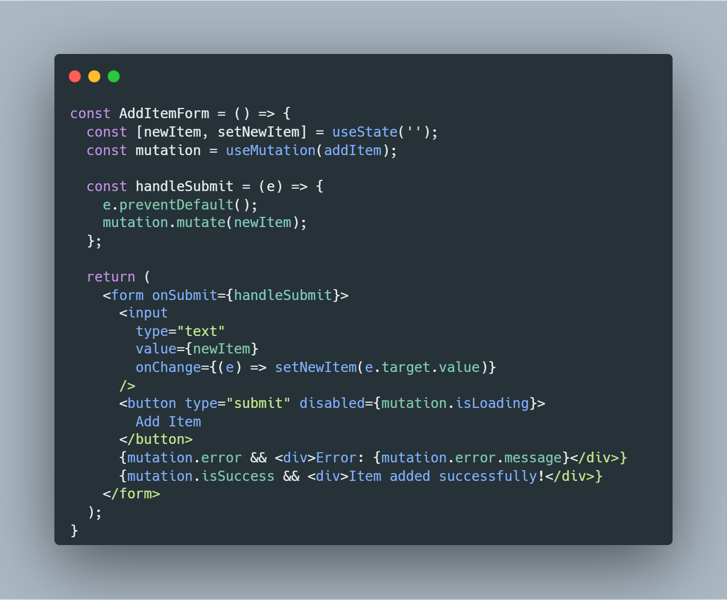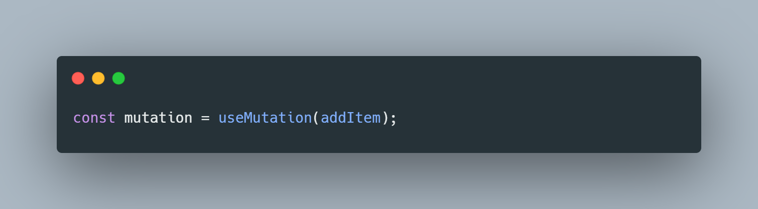 이제 우리는 addItem이라는 함수를 가지고 있다. 다음은 useMutation 훅에 이 함수를 인자로 넘겨 mutation을 생성하면 된다. 이 mutation은 mutation의 state, isLoading, error와 같은 states, mutate, mutateAsync와 같은 함수들이 포함된 객체를 반환한다. 컴포넌트 내부에서 이런 값과 함수를 이용하여 mutation 상태를 처리하고 mutation을 트리거할 수 있다.