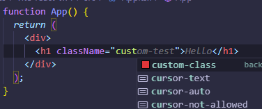 하지만 이렇게 정의된 클래스는 리액트 컴포넌트에서 타이핑 시 자동완성 힌트로 나타나지를 않았습니다. className="cus"까지 타이핑해도 추천이 뜨지 않았습니다.